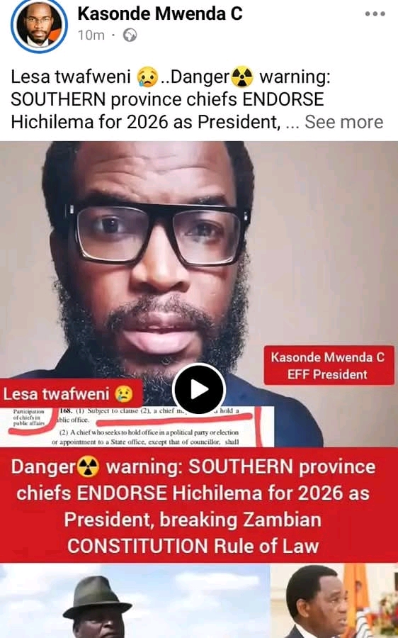 Kasonda Mwenda’s recent article on the chiefs from Southern Province endorsing President Hakainde Hichilema for 2026 is a classic example of selective reporting and double standards. It’s surprising that he’s suddenly concerned about the constitution and rule of law when chiefs from various provinces have been endorsing political leaders for years.
