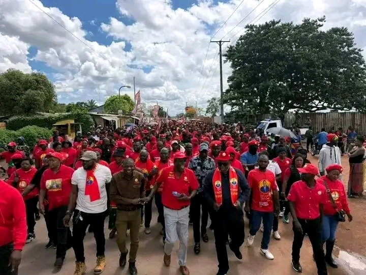 The pictures coming out of Chililabombwe today tell their own story. A tight, disciplined march. A sea of red. Raised hands. Party scarves. Drums. Children running toward the stage. Elderly women wrapped in chitenge. It is a political performance staged with purpose, only seven days after the most serious security breach of President Hakainde Hichilema’s tenure.