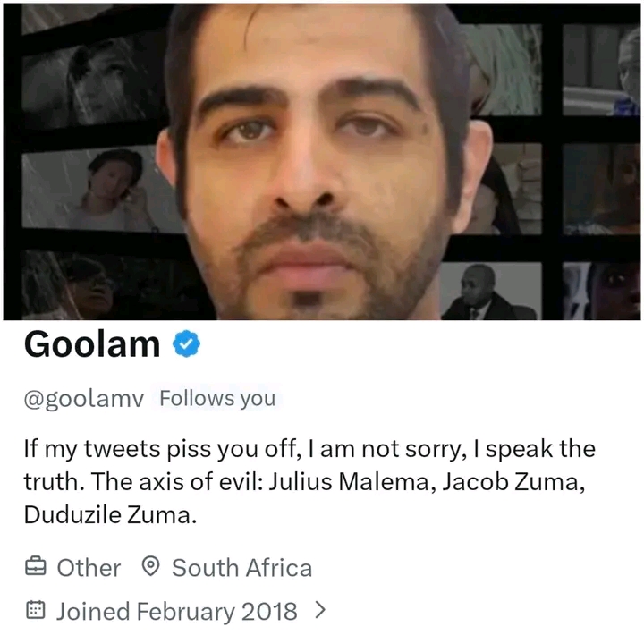 Vawda was a well-known and highly polarising figure on South African social media. Through the @goolamv account, he built a large following by posting political memes, sharp commentary and controversial claims, often targeting senior political figures such as EFF leader Julius Malema and members of former President Jacob Zuma’s family. Supporters saw him as a fearless digital activist exposing what he believed were abuses of power. Critics accused him of harassment, spreading misinformation and crossing legal and ethical lines.