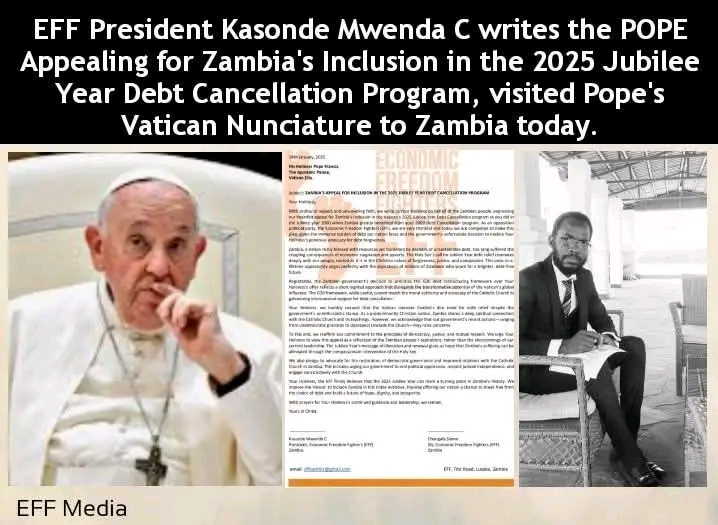 Your Holiness, the EFF firmly believes that the 2025 Jubilee Year can mark a turning point in Zambia’s history. We implore the Vatican to include Zambia in this noble initiative, thereby offering our nation a chance to break free from the chains of debt and build a future of hope, dignity, and prosperity.