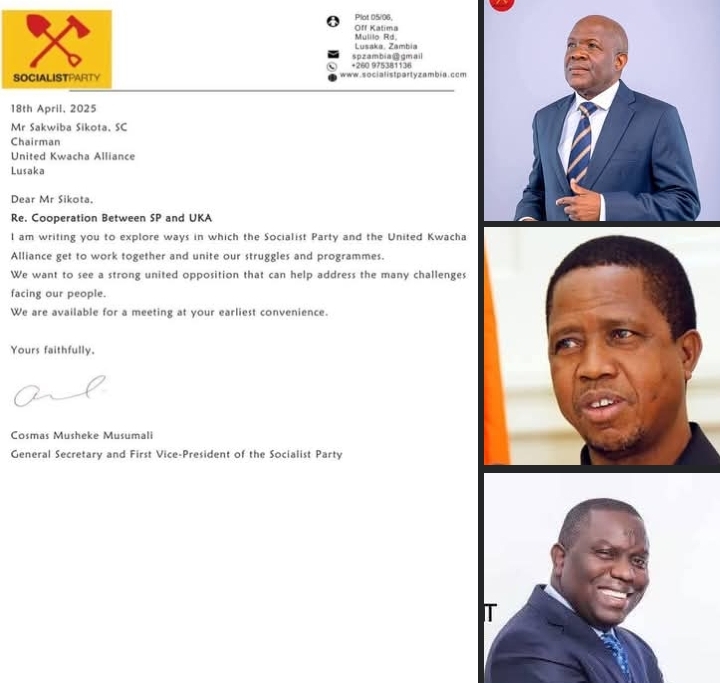 His Close Ally Cosmas Musumali who is the Socialist Party Secretary General has written to another three member opposition grouping, United Kwacha Alliance for a collaboration.