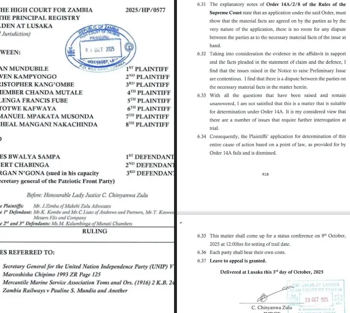 Judge Chiyanwa Zulu has since called for a status conference on 9th October 2025 to allocate dates for trial.