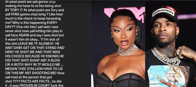 “At what point are yall gonna stop making me have to re live being shot BY TORY !? At what point are Tory and yall FANS gonna stop lying ? Like how much is the check to keep harassing me? Why is this happening EVERY DAY?” Meg wrote. “One min him/ yall said I was never shot now yall letting him play in yall face AGAIN and say I was shot but it wasn’t him oh okay… ?!