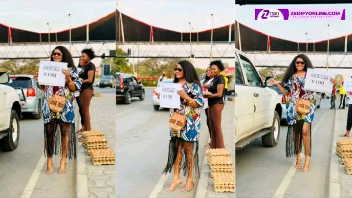 TOP media personality Mutale Mwaza took to Great East Road, Manda Hill flyover bridge to sell her 100 Kwacha a tray “HUNCHO” eggs.