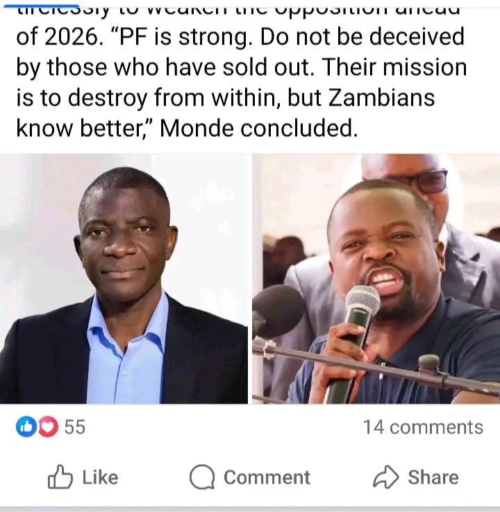PF’s crisis is PF’s burden. Monde must stop exporting that chaos to UPND, because Zambians know that PF’s fall is the work of PF leaders themselves, not anyone else.