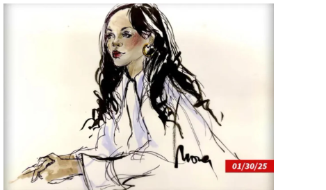 Court sketches indicated she had large hoop earrings with her black locks down and parted during the legal proceedings, as TMZ reported she donned a ‘button-up white top, skinny black tie, black work pants and black pointy pumps.’