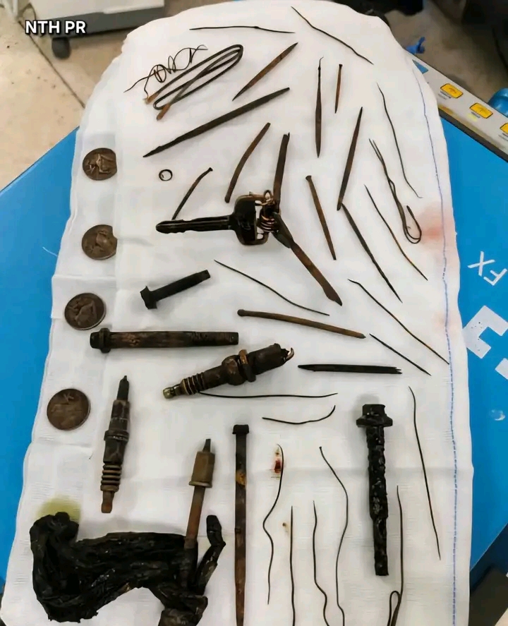 When the procedure was completed, the surgical table told the full story: among the extracted objects were 2 car spark plugs, 17 sharp wire pieces, one car key and two padlock keys, s 4 one-kwacha coins (including one lodged in the large intestine), 4 bolts, 1 female bra wire stabilizer, and a ring wire. The shocking collection was carefully laid out on a surgical cloth for documentation.