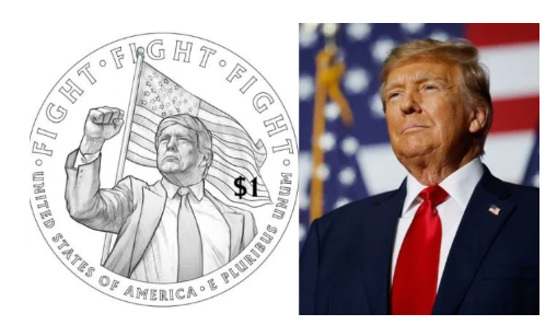 The reverse side of the coin depicts President Trump with a raised, clenched fist in front of an American flag, with the words “fight, fight, fight” inscribed. This imagery is a reference to a statement he made after surviving an assassination attempt last year.