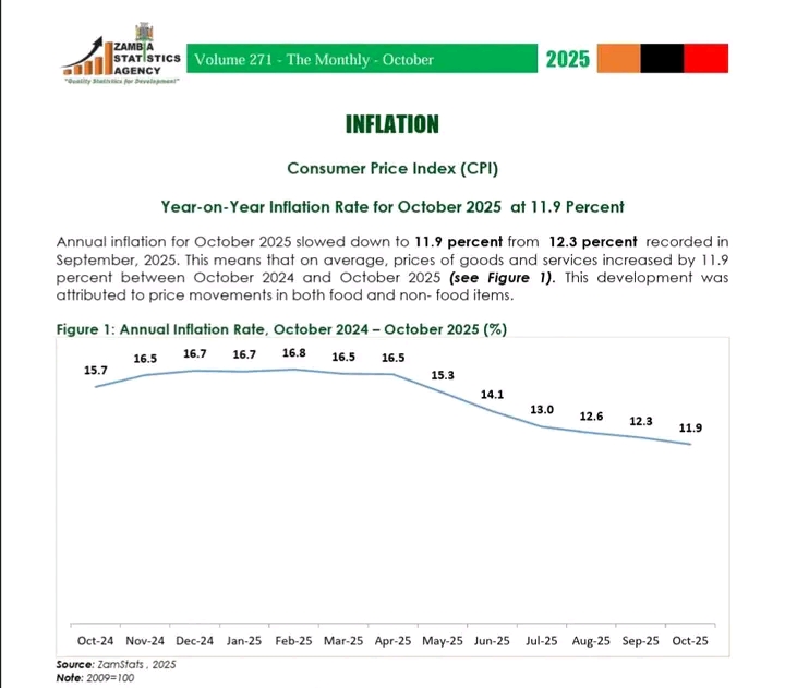 …Zambia’s annual inflation slowed to 11.9 percent in October 2025, down from 12.3 percent in September…